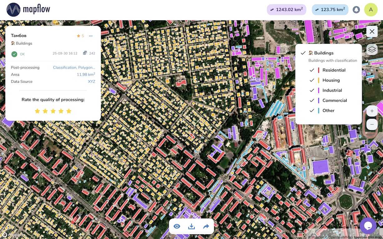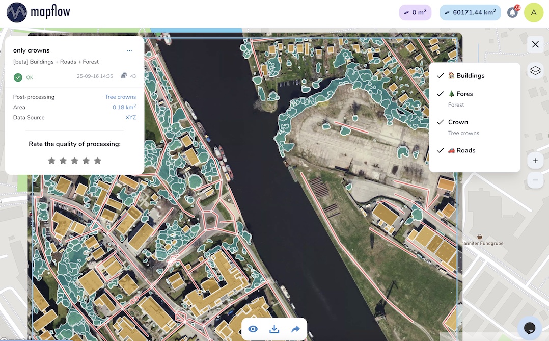 If your image doesn’t meet the params above, we suggest to use Mapflow API / QGIS plugin which have more capabilities. There you can also use our new My imagery tool for storing and processing multiple images. Mapflow supports RGB imagery and also process single-band (panchromatic) imagery, but the AI models are not tuned for such kind of data, so the quality of the result may be worse than expected.
