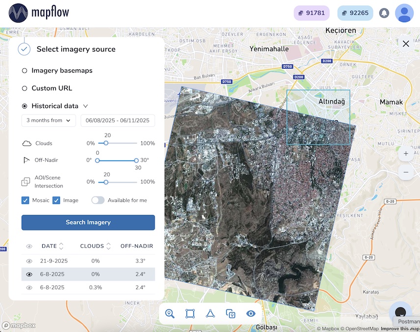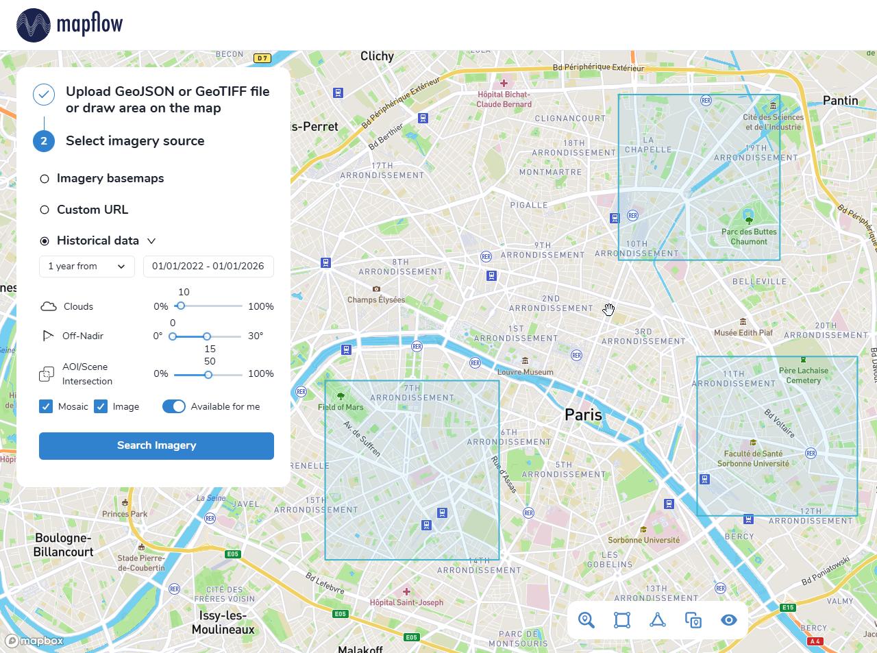 👉 See Mapflow <> QGIS for more information on how to use Imagery Search in Mapflow Web and QGIS plugin.