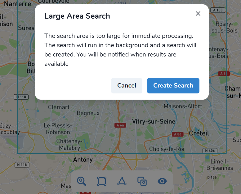 If the total area of your search area exceeds 250 km², when you click on “Search Imagery” instead of an immediate search, you will be prompted to create a postponed background search.