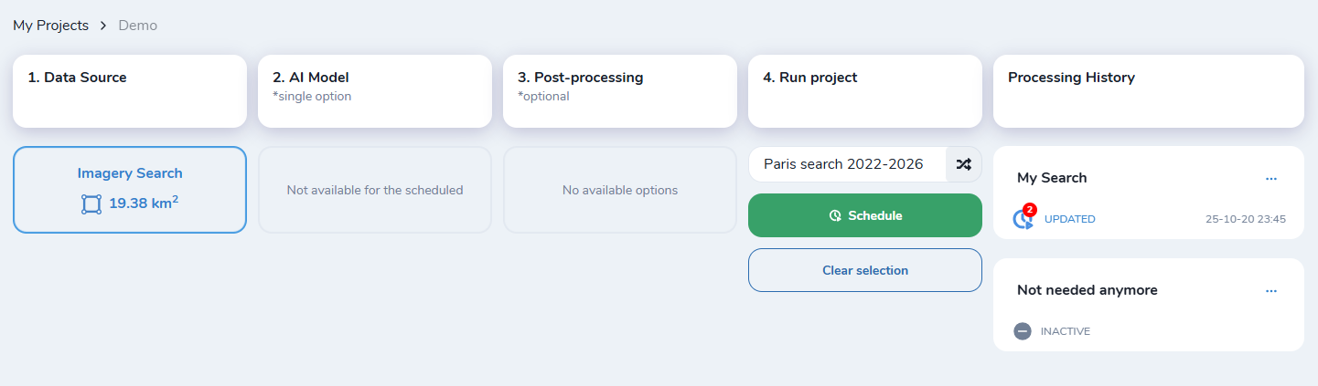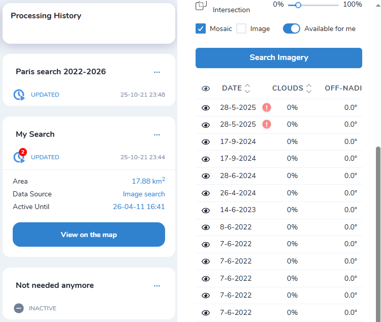 “View on the map” → Adjust the search parameters → “Search Imagery” → “Save as schedule”. Now the background search will work according to the new parameters.